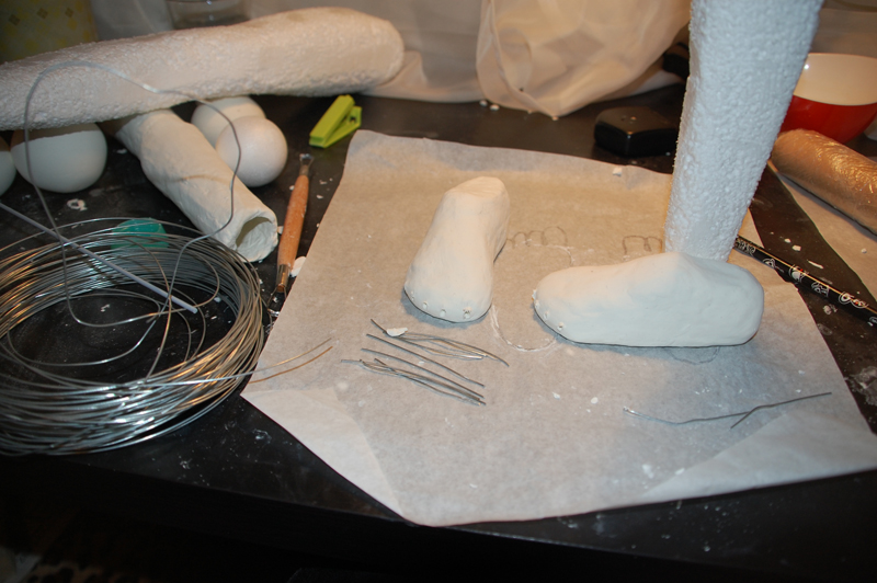 1. Man nehme die ausgewählten Styroporkugeln und bedecke diese gleichmäßig!!! mit einer ca. 1cm dicken Schicht Modelliermasse- pfähle diese und lasse sie trocknen.